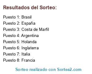 Lista de participantes: España, Brasil, Inglaterra, Holanda, Italia, Francia, Argentina, Costa de Marfil.