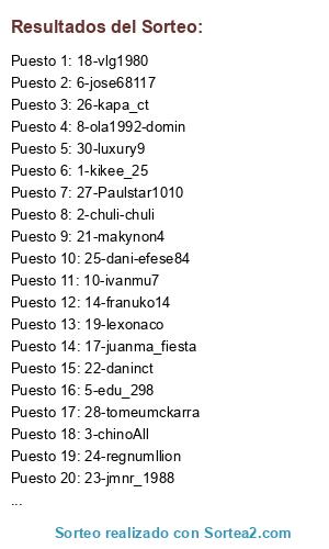 Lista de participantes: 1-kikee_25, 2-chuli-chuli, 3-chinoAll, 4-er_t0j3, 5-edu_298, 6-jose68117, 7-mueroencai, 8-ola1992-domin, 9-toonino, 10-ivanmu7, 11-alvypatry, 12-toribio93, 13-titokameni, 14-franuko14, 15-ganso15, 16-el_lentejas, 17-juanma_fiesta, 18-vlg1980, 19-lexonaco, 20-caicf, 21-makynon4, 22-daninct, 23-jmnr_1988, 24-regnumllion, 25-dani-efese84, 26-kapa_ct, 27-Paulstar1010, 28-tomeumckarra, 29-pempus, 30-luxury9.