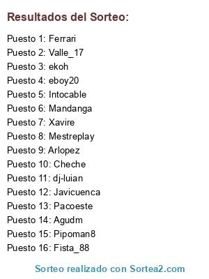 Lista de participantes: Valle_17, Intocable, Cheche, Agudm, Fista_88, Mestreplay, Pacoeste, Pipoman8, Mandanga, Xavire, dj-luian, Arlopez, eboy20, Javicuenca, ekoh, Ferrari.