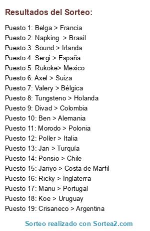 Lista de participantes: Ben > Alemania, Napking > Brasil, Crisaneco > Argentina, Sergi > España, Belga > Francia, Valery > Bélgica, Tungsteno > Holanda, Ricky > Inglaterra, Manu > Portugal, Divad > Colombia, Poller > Italia, Koe > Uruguay, Jariyo > Costa de Marfil, Ponsio > Chile, Rukoke> Mexico, Morodo > Polonia, Jan > Turquía, Axel > Suiza, Sound > Irlanda.