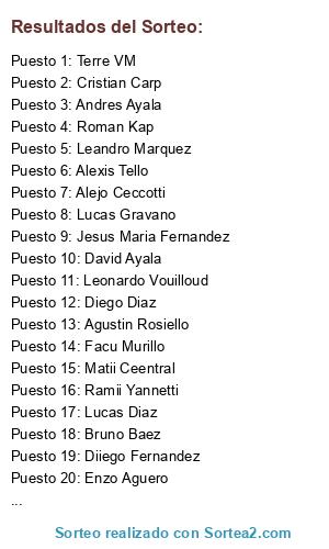 Lista de participantes: Leonardo Vouilloud, Diego Diaz, Terre VM, Facu Murillo, Braian Pes, Jesus Maria Fernandez, Agustin Rosiello, Enzo Aguero, Javi Vargas, David Ayala, Roman Kap, Andres Ayala, Lucas Diaz, Rodri Rio, Maxy Ojeda, Ramii Yannetti, Rodri Matamala, Leandro Marquez, Alejo Ceccotti, Cristian Carp, Agustin Ayala, Alejandro Aguirre, Ariel Miranda, Matii Ceentral, Bruno Baez, Diiego Fernandez, Lucas Gravano, Milton Tamaso, Alexis Tello, Marcelo Aguirre.