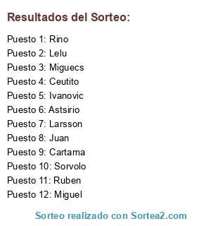 Lista de participantes: Rino, Cartama, Astsirio, Larsson, Juan, Ruben, Miguecs, Sorvolo, Miguel, Ivanovic, Ceutito, Lelu.