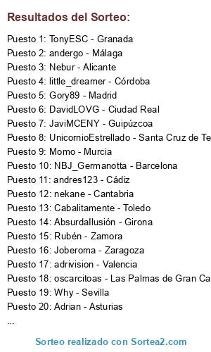 Lista de participantes: Why - Sevilla , Gory89 - Madrid , Momo - Murcia , adrivision - Valencia , nekane - Cantabria , andres123 - Cádiz , Nebur - Alicante , andergo - Málaga , NBJ_Germanotta - Barcelona , AbsurdaIlusión - Girona , TonyESC - Granada , Joberoma - Zaragoza , JaviMCENY - Guipúzcoa , Cabalitamente - Toledo , little_dreamer - Córdoba , zoracs - Almería , Adrian - Asturias , oscarcitoas - Las Palmas de Gran Canaria , UnicornioEstrellado - Santa Cruz de Tenerife, DavidLOVG - Ciudad Real, Rubén - Zamora.