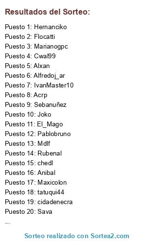 Lista de participantes: chedl, El_Mago, Tomymaina, Joko, Mdlf, Brito, Alfredoj_ar, Sava, Acrp, Flocatti, IvanMaster10, Cwal99, Alxan, Rubenal, Anibal, Marianogpc, Maxicolon, tatuqui44, cidadenecra, Sebanuñez, Pablobruno, Punk77, Hernanciko.