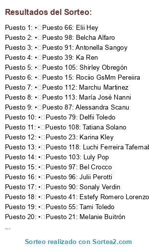 Lista de participantes: • Puesto 1: Ana Maria Estevez, • Puesto 2: Marianela Alberti, • Puesto 3: Cami Peralta, • Puesto 4: Natu Guastoni, • Puesto 5: Mely Romero, • Puesto 6: Centro Dharma Grihasta, • Puesto 7: Cami Acetosella Carp, • Puesto 8: Elsa Figueroa, • Puesto 9: Eve Sanchez II, • Puesto 10: Dhaniix Luz, • Puesto 11: Luciana Villacorta, • Puesto 12: Julia Porciuncula, • Puesto 13: Valü Arce Aguilar, • Puesto 14: Valentina Petracca, • Puesto 15: Rociio GsMm Pereiira, • Puesto 16: Ale Porro FcOficial, • Puesto 17: Mariano Martínez, • Puesto 18: Juliana Lopez, • Puesto 19: Olga Guevara, • Puesto 20: Jesi Freire, • Puesto 21: Melanie Buitrón, • Puesto 22: Valen Leiva, • Puesto 23: Karina Kley, • Puesto 24: Mati Perotti, • Puesto 25: Ailu Hernandez, • Puesto 26: Ari Fabre, • Puesto 27: Eugenia Santos, • Puesto 28: Pelu Troche, • Puesto 29: Lu Espósito, • Puesto 30: Francesca Lali D'Eusebio, • Puesto 31: Delfina Flores Duran, • Puesto 32: Lu Martinez, • Puesto 33: Jo Asselborn, • Puesto 34: Isaias Cabj, • Puesto 35: Anto Waldner, • Puesto 36: Mariana Espósito, • Puesto 37: Ailu Fernandez, • Puesto 38: Erika Monserrat Torres, • Puesto 39: Ka Ren, • Puesto 40: Anahi Maraz, • Puesto 41: Estefy Romero Lorenzo, • Puesto 42: Yass Muñoz, • Puesto 43: Mica Perrone, • Puesto 44: Iván Rodríguez, • Puesto 45: Eii Mel, • Puesto 46: Euuge Lencina, • Puesto 47: Constanza Bibiloni, • Puesto 48: Milii Mendez, • Puesto 49: Fernanda Samartino, • Puesto 50: Jenii Michillón, • Puesto 51: La Salvajita Spain De Vico, • Puesto 52: Maguii Cabj, • Puesto 53: Mireia Rosa, • Puesto 54: Virgi Godoy Iriarte, • Puesto 55: Tami Toledo, • Puesto 56: Javiera Romero, • Puesto 57: Biian Manavella DC, • Puesto 58: Rossy Rotela, • Puesto 59: Andree Marich, • Puesto 60: Noelia Arias, • Puesto 61: Maruu Foor Ever, • Puesto 62: Estefania Candela Elordi, • Puesto 63: Caro Cuenca, • Puesto 64: Marina Rico, • Puesto 65: Gabriela Solange, • Puesto 66: Elii Hey, • Puesto 67: Aldana Gómez, • Puesto 68: Lali Bertotti, • Puesto 69: Belen Bonini, • Puesto 70: Es Simple, Es claro, soy Griseldita, Acéptalo, • Puesto 71: Malee Cuerva, • Puesto 72: Rodrigo Ismael Barragan, • Puesto 73: Lourdes Maña, • Puesto 74: Cecilia Brenes, • Puesto 75: Mar Gasol, • Puesto 76: Nastenka Panterita de Mariano, • Puesto 77: Luchii Ramos, • Puesto 78: Andrea Catalina Duran Leal, • Puesto 79: Delfii Toledo, • Puesto 80: Mili Villa, • Puesto 81: Larissa Oliveira, • Puesto 82: Cristina Viveros, • Puesto 83: Pauli Alvarez, • Puesto 84: Flor Crujak, • Puesto 85: María Alejandra Mulet Velasco, • Puesto 86: Rochu Gonzalez Jerez, • Puesto 87: Alessandra Scanu, • Puesto 88: Mara Fernandez, • Puesto 89: Irina Pavlova, • Puesto 90: Sonaly Verdin, • Puesto 91: Antonella Sangoy, • Puesto 92: Manu Boca, • Puesto 93: Diletta Balsamo, • Puesto 94: Yessica YuKa, • Puesto 95: Juli Gervasoni, • Puesto 96: Julii Perotti, • Puesto 97: Bel Crocco, • Puesto 98: Belcha Alfaro, • Puesto 99: Flopy Musa, • Puesto 100: Giuh Fantozzi, • Puesto 101: Fernanda Veron, • Puesto 102: Sol Maria, • Puesto 103: Luly Pop, • Puesto 104: Elias CA, • Puesto 105: Shirley Obregón, • Puesto 106: Soledad Castaño, • Puesto 107: Franshesca López, • Puesto 108: Tatiana Solano, • Puesto 109: Camila Pilarche, • Puesto 110: Es Simple, Es Claro, Soy Mariego, Aceptalo, • Puesto 111: Noelia Carena, • Puesto 112: Marchu Martinez, • Puesto 113: María José Nanni, • Puesto 114: Ana Hochsprung, • Puesto 115: Vicky OLiveira, • Puesto 116: Daniela Lucia, • Puesto 117: Any Ruefli, • Puesto 118: Luchi Ferreira Tafernaberry, • Puesto 119: Lizzie Olmedo, • Puesto 120: Marcos Arancibia.