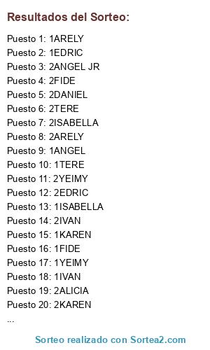 Lista de participantes: 1TERE, 1FIDE, 1YEIMY, 1EDRIC, 1IVAN, 1DANIEL, 1ANGEL, 1ALICIA, 1KAREN, 1ISABELLA, 1ARELY, 1ANGEL JR, 2TERE, 2FIDE, 2YEIMY, 2EDRIC, 2IVAN, 2DANIEL, 2ANGEL, 2ALICIA, 2KAREN, 2ISABELLA, 2ARELY, 2ANGEL JR.