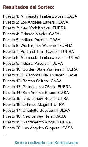 Lista de participantes: Boston Celtics CASA, New Jersey Nets CASA, New York Knicks CASA, Philadelphia 76ers CASA, Toronto Raptors CASA, Chicago Bulls CASA, Cleveland Cavaliers CASA, Detroit Pistons CASA, Indiana Pacers CASA, Milwaukee Bucks CASA, Atlanta Hawks CASA, Charlotte Bobcats CASA, Miami Heat CASA, Orlando Magic CASA, Washington Wizards CASA, Dallas Mavericks CASA, Houston Rockets CASA, Memphis Grizzlies CASA, New Orleans Pelicans CASA, San Antonio Spurs CASA, Denver Nuggets CASA, Minnesota Timberwolves CASA, Portland Trail Blazers CASA, Oklahoma City Thunder CASA, Utah Jazz CASA, Golden State Warriors CASA, Los Angeles Clippers CASA, Los Angeles Lakers CASA, Phoenix Suns CASA, Sacramento Kings CASA, Boston Celtics FUERA, New Jersey Nets FUERA, New York Knicks FUERA, Philadelphia 76ers FUERA, Toronto Raptors FUERA, Chicago Bulls FUERA, Cleveland Cavaliers FUERA, Detroit Pistons FUERA, Indiana Pacers FUERA, Milwaukee Bucks FUERA, Atlanta Hawks FUERA, Charlotte Bobcats FUERA, Miami Heat FUERA, Orlando Magic FUERA, Washington Wizards FUERA, Dallas Mavericks FUERA, Houston Rockets FUERA, Memphis Grizzlies FUERA, New Orleans Pelicans FUERA, San Antonio Spurs FUERA, Denver Nuggets FUERA, Minnesota Timberwolves FUERA, Portland Trail Blazers FUERA, Oklahoma City Thunder FUERA, Utah Jazz FUERA, Golden State Warriors FUERA, Los Angeles Clippers FUERA, Los Angeles Lakers FUERA, Phoenix Suns FUERA, Sacramento Kings FUERA.