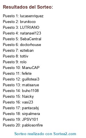Lista de participantes: brunitoco, buho1108, doctorhouse, ezteban, fefete, guilloteai3, JPSV101, lucasenriquez, LUTRIANO, ManuCAP, matisarue, Naicky, natanael123, pablosonfire, pantacabj, rolo, SebaCentral, sirpalmera, tottiv, vasi23.