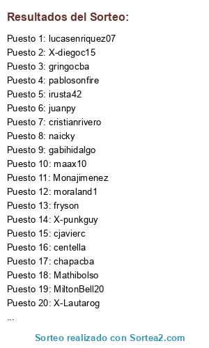 Lista de participantes: campeon2004, centella, chapacba, cjavierc, cristianrivero, cristinorodrigo, fryson, gabihidalgo, gringocba, irusta42, jmpkb8, juanpy, lucasenriquez07, maax10, mandingo, mariano801, Mathibolso, MiltonBell20, Monajimenez, moraland1, naicky, pablosonfire, rodrigorivero, X-andyycentral, X-dalokoz, X-diegoc15, X-gustavom, X-Lautarog, X-maxy4267, X-punkguy.