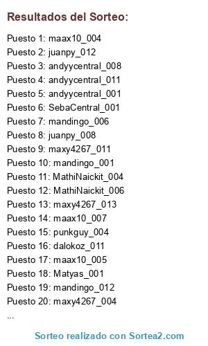 Lista de participantes: andyycentral_001, andyycentral_002, andyycentral_003, andyycentral_004, andyycentral_005, andyycentral_006, andyycentral_007, andyycentral_008, andyycentral_009, andyycentral_010, andyycentral_011, andyycentral_012, andyycentral_013, andyycentral_014, andyycentral_015, andyycentral_016, dalokoz_001, dalokoz_002, dalokoz_003, dalokoz_004, dalokoz_005, dalokoz_006, dalokoz_007, dalokoz_008, dalokoz_009, dalokoz_010, dalokoz_011, dalokoz_012, dalokoz_013, dalokoz_014, dalokoz_015, dalokoz_016, fryson_001, fryson_002, fryson_003, fryson_004, fryson_005, fryson_006, fryson_007, fryson_008, fryson_009, fryson_010, fryson_011, fryson_012, fryson_013, fryson_014, fryson_015, fryson_016, juanpy_001, juanpy_002, juanpy_003, juanpy_004, juanpy_005, juanpy_006, juanpy_007, juanpy_008, juanpy_009, juanpy_010, juanpy_011, juanpy_012, juanpy_013, juanpy_014, juanpy_015, juanpy_016, maax10_001, maax10_002, maax10_003, maax10_004, maax10_005, maax10_006, maax10_007, maax10_008, maax10_009, maax10_010, maax10_011, maax10_012, maax10_013, maax10_014, maax10_015, maax10_016, mandingo_001, mandingo_002, mandingo_003, mandingo_004, mandingo_005, mandingo_006, mandingo_007, mandingo_008, mandingo_009, mandingo_010, mandingo_011, mandingo_012, mandingo_013, mandingo_014, mandingo_015, mandingo_016, maxy4267_001, maxy4267_002, maxy4267_003, maxy4267_004, maxy4267_005, maxy4267_006, maxy4267_007, maxy4267_008, maxy4267_009, maxy4267_010, maxy4267_011, maxy4267_012, maxy4267_013, maxy4267_014, maxy4267_015, maxy4267_016, MathiNaickit_001, MathiNaickit_002, MathiNaickit_003, MathiNaickit_004, MathiNaickit_005, MathiNaickit_006, MathiNaickit_007, MathiNaickit_008, punkguy_001, punkguy_002, punkguy_003, punkguy_004, punkguy_005, punkguy_006, punkguy_007, punkguy_008, moraland1_001, moraland1_002, moraland1_003, moraland1_004, SebaCentral_001, SebaCentral_002, SebaCentral_003, SebaCentral_004, Monajimenez_001, Monajimenez_002, Matyas_001.