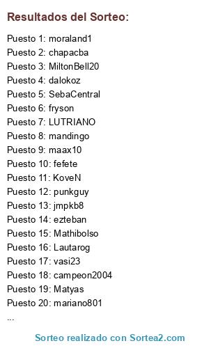Lista de participantes: andyycentral, campeon2004, chapacba, cjavierc, dalokoz, diegoc15, ezteban, fefete, fryson, jmpkb8, JPSV101, juanpy, KoveN, Lautarog, LUTRIANO, maax10, mandingo, mariano801, Marqitos, Mathibolso, Matyas, maxy4267, MiltonBell20, Monajimenez, moraland1, naicky, punkguy, Razinger, SebaCentral, vasi23.