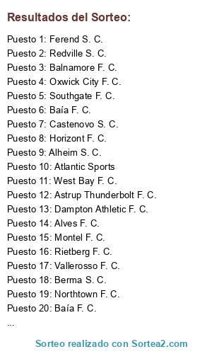 Lista de participantes: Baía F. C., Horizont F. C., Ferend S. C., Montel F. C., Alves F. C., Rietberg F. C., Southgate F. C., Vallerosso F. C., Alheim S. C., Novafonte S. C., Balnamore F. C., Berma S. C., Astrup Thunderbolt F. C., Northtown F. C., Castenovo S. C., Oxwick City F. C., Redville S. C., West Bay F. C., Atlantic Sports, Dampton Athletic F. C..