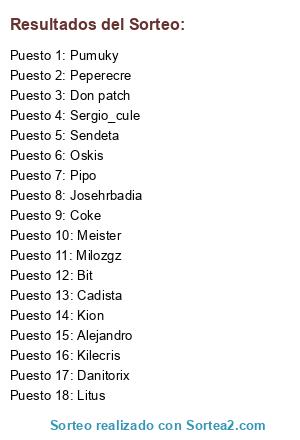 Lista de participantes: Kion, Alejandro, Oskis, Cadista, Bit, Pipo, Killercris, Meister, Milozgz, Danitorix, Josehrbadia, Sendeta, Don Patch, Coke, Pumuky, Sergio_cule, Peperecre, Litus.