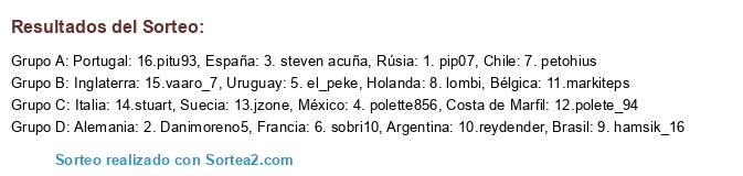 Lista de participantes: España: 3. steven acuña, Brasil: 9. hamsik_16, Holanda: 8. lombi, Alemania: 2. Danimoreno5, Portugal: 16.pitu93, Argentina: 10.reydender, Italia: 14.stuart, Bélgica: 11.markiteps, Uruguay: 5. el_peke, Rúsia: 1. pip07, Francia: 6. sobri10, Suecia: 13.jzone, Chile: 7. petohius, Inglaterra: 15.vaaro_7, México: 4. polette856, Costa de Marfil: 12.polete_94.