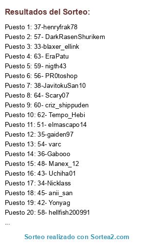 Lista de participantes: 33-blaxer_ellink, 34-Nicklass, 35-gaiden97, 36-Gabooo, 37-henryfrak78, 38-JavitokuSan10, 39-sasukevic, 40- Fram777, 41- Paulee23, 42- Yonyag, 43- Uchiha01, 44- Valee95, 45- anii_san, 46- Cheers, 47- YellowFlash, 48- Manex_12, 49- Juka93, 50- Facuu55, 51- elmascapo14, 52- Feligatin, 53- NeoHost_93, 54- varc, 55- Uchiha_NNK, 56- PR0toshop, 57- DarkRasenShurikem, 58- hellfish200991, 59- nigth43, 60- criz_shippuden, 61- ficha22, 62- Tempo_Hebi, 63- EraPatu, 64- Scary07.