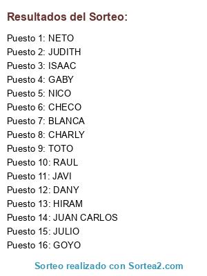 Lista de participantes: TOTO, CHECO, GABY, JUDITH, ISAAC, JAVI, NICO, RAUL, NETO, BLANCA, CHARLY, GOYO, JUAN CARLOS, JULIO, HIRAM, DANY.