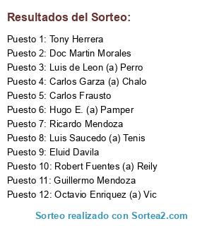Lista de participantes: Luis de Leon (a) Perro, Luis Saucedo (a) Tenis, Carlos Frausto, Robert Fuentes (a) Reily, Octavio Enriquez (a) Vic, Guillermo Mendoza, Eluid Davila, Tony Herrera, Ricardo Mendoza, Doc Martin Morales, Carlos Garza (a) Chalo, Hugo E. (a) Pamper.