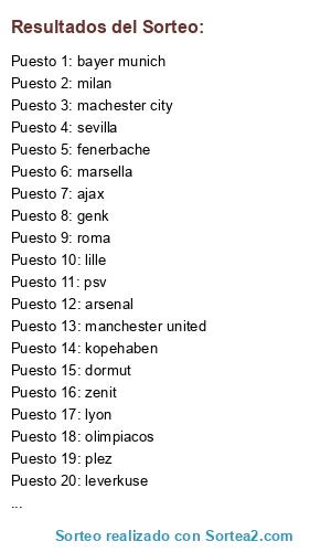 Lista de participantes: rubin, marsella, kopehaben, benfica, milan, olimpiacos, lille, oporto, schalke 04, manchester united, bayer munich, madrid, roma, chelsea, fenerbache, lyon, ranger, celtic, arsenal, sevilla, leverkuse, zenit, genk, barcelona, ajax, inter milan, villareal, juventus, dormut, plez, psv, machester city.