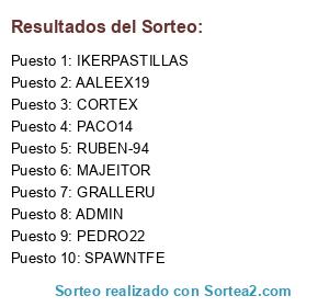 Lista de participantes: GRALLERU, IKERPASTILLAS, AALEEX19, RUBEN-94, MAJEITOR, ADMIN, PACO14, PEDRO22, SPAWNTFE, CORTEX.