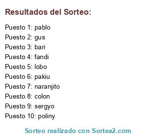 Lista de participantes: colon, bari, naranjito, pablo, fandi, poliny, lobo, sergyo, gus, pakiu.
