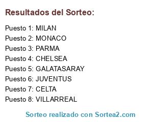 Lista de participantes: CHELSEA, JUVENTUS, PARMA, GALATASARAY, MILAN, VILLARREAL, MONACO, CELTA.