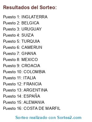 Lista de participantes: SUIZA, CROACIA, BELGICA, COLOMBIA, FRANCIA, URUGUAY, GHANA, CAMERUN, INGLATERRA, MEXICO, COSTA DE MARFIL, TURQUIA, ITALIA, ALEMANIA, ARGENTINA, ESPAÑA.