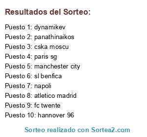 Lista de participantes: sl benfica, fc twente, dynamikev, cska moscu, panathinaikos, atletico madrid, manchester city, napoli, paris sg, hannover 96.