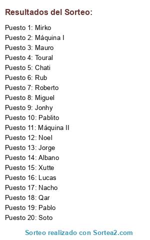Lista de participantes: Lucas, Qar, Noel, Miguel, Jonhy, Xutte, Pablo, Rub, Chati, Nacho, Roberto, Mauro, Mirko, Pablito, Toural, Soto, Jorge, Máquina I, Máquina II, Albano.