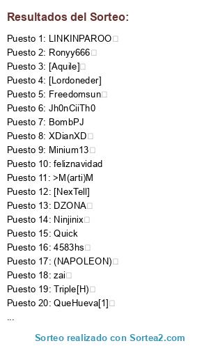 Lista de participantes: zai, 4583hs, BombPJ, [Lord][Zack], Freedomsun, SworD06, Minium13, (NAPOLEON), [PRO]Carlus, Quick<, feliznavidad, jkm15, LINKINPAROO, [Aquile], Triple[H), [Lordoneder], DZONA, [Tooru]AD, [NexTell], zlatan456, Ninjinix, Ronyy666, Maincra[YT], ThoL0kiToPXd, QueHueva[1], RoGeRG, >M(arti)M<, [GameOn], fabricio4545, XDianXD, Jh0nCiiTh0, piero2135.
