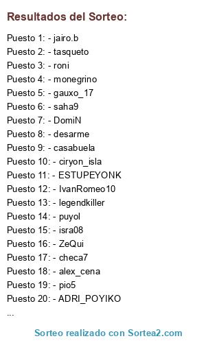 Lista de participantes: - gauxo_17, - adrian_illie, - isra08, - IvanRomeo10, - tasqueto, - legendkiller, - ADRI_POYIKO, - casabuela, - checa7, - ESTUPEYONK, - jairo.b, - Li0nheart_css, - mhg82, - ciryon_isla, - saha9, - jordigrao, - roni, - alex_cena, - desarme, - monegrino, - DomiN, - ZeQui, - puyol, - pio5.