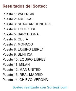 Lista de participantes: REAL MADRID, VALENCIA, BARCELONA, BENFICA, CHIEVO VERONA, SHAKTAR DONETSK, CELTA, MAN UNITED, ARSENAL, TOULOUSE, MILAN, MONACO, EQUIPO LIBRE1, EQUIPO LIBRE2.