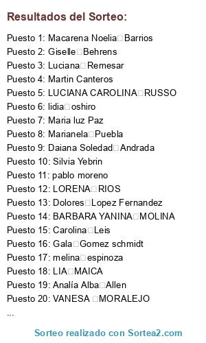 Lista de participantes: pamela Silvia Estrella(2 participaciones), jeanette vergara, Hernan Banegas, Gabriel Eduardo Acosta, Cecilia Eckerdt, Macarena Vallejos, Analia Beatriz Sanabria(2 participaciones), maria cecilia tello, PABLO GARCIA DE AMORRORTU, Natalia Mariani(2 participaciones), Maria luz Paz, ROSINA SOLEDAD MORENO, LUCIANA UVILLA(5 participaciones), Carolina Giacobini, pablo moreno(6 participaciones), Johanna Salto, romina damus, Paula Di marco, Maria Rosa Garcia, VALENTINA ANDREA TEDESCO, Estefania Caceres(2 participaciones), Luciana Candia, María Flores, Silvina Czekaj, Jimena Soledad Lopez Artos, ELIZABETH NANCY ROMERO(2 participaciones), Lucia Mouriño, Valeria Esther González(2 participaciones), nora beatriz olivares, Noelia Duarte, Gladys Mabel Vera silvero, Lerida borras(2 participaciones), Daiana Miceli(2 participaciones), Vanina Ermolovich, Maite Rabellato, MARIEL GOMEZ, Roxana Aiello, Romina Capano, Monica Trimboli, Macarena Noelia Barrios, Gael Arrigo Spath, maria evangelina simos, Laura Vanesa Ocampo, Ruben Martinez(3 participaciones), Gisela Erramuspe, cARLA Ra, Sulma De Lujan Rivero, Débora Szablewski, yesica ceijas, Vanesa Leguizamon, Candela Vilches, ADRIANA CAROLINA LICITRA(2 participaciones), Daiana Sabrina Bianco, Luciano Gabriel Santillan, Silvia Yebrin(2 participaciones), ROMINA LOYOLA(5 participaciones), Melisa Ramirez, Laura Natalia Velan, Anabela Lopez, Romina Victorel, Martin Canteros(2 participaciones), Evangelina Murua, Sandra Liliana Lozano(2 participaciones), Anabel Torres, Mariela Gonzalez, Soledad Olguin(2 participaciones), Paola Varela, Marcelina Noemi Rios(2 participaciones), Monica Veliz, EMA GARCIA ROMERO, Julieta Devecchi(3 participaciones), edith damasco, Analía Alba Allen(2 participaciones), Julieta belen Tabarosa(5 participaciones), Magdalena Conti(2 participaciones), BERTHA VERDE(2 participaciones), Alberto José Barbosa, Samanta Anahi Gomez, Camila Bertolini(2 participaciones), Angélica Jorgelina Asal, Jorge Delgado, Barbara Segovia, Vanesa Elias, Marianela Puebla(3 participaciones), viviana catalina acosta, IVANA ARAGON, flavia arroyo, Sonia Possetti, melina espinoza(2 participaciones), Soledad pamela Leguizamon, Verónica Mendieta, ESTELA ADRIANA ARROSTITO DI FONZO(2 participaciones), Gabriel ezequiel Vega(2 participaciones), Iara Rosso, maría cecilia Capria, Leonor Seta, Anabel Borrero, flavia lorena carrizo, VALERIA LAURA CUSNIER, graciels ayala, Victoria Achával(2 participaciones), BLANCA BENITEZ, MARIELA CAROLINA TREJO, Gabriela Gomez, Fernando Gioiosa, Karina Isabel Carlos, Verónica Diaz, Flavia López, Carolina Siciliano, valeria demaria, Laura Flor Carranza Fernández, daniela sheila seguel vargas, Cecilia Satler, GISELA ALEJANDRA PERALTA, Carolina Leis, Analia Farias, Celia Florencia Olguin, Maria Di pasquo(2 participaciones), Leticia Ciancio(2 participaciones), Cristina De Rosa, María cristina Bravo, maria alejandra santos, LIA MAICA(2 participaciones), Marcela Riffel, Carla patricia Rocha romano, Liliana Figueredo, Diana susan Gutiérrez Quispe, Sabrina Ogasawara, VANESA MORALEJO, Maximo Tannchen Bomchol, Constanza Schmid, Marcos Javier Rosica, Marcela Alejandra Radojkovic, Gala Gomez schmidt, lidia oshiro(2 participaciones), silvina hevia, Alejandra Noemí Díaz, gabriela fernandez(2 participaciones), monica liliana stevovich, Luciana Remesar, ANDREA FABIANA TURKOWICZ, Leonardo Pasquini(2 participaciones), Andrea Crossa, Fresia Agustina Ibaceta Moya(2 participaciones), Diego Fernando Valverde Badilla, Gabriel Alejandro Sosa, diego herrera(2 participaciones), Mariana Perez, MARIA BELEN VON DER BECKE, natalia saiegh(2 participaciones), Laura Basile, DENISE SALAMO BIASETTON, Alejandra Machado, Maria Eugenia Torrellas, Marcela Altamirano, mirta olga Uccello, Cecilia Otegui, Fernando Ruben Benitez(2 participaciones), Mónica Elizabeth de Salazar, Virginia Santoocito(2 participaciones), Mónica roxana Paz, Graciela Haydee Accorroni, Mariela Adriana Walter, Daiana Soledad Andrada(3 participaciones), Teresa Olmos, Patricia Borysewycz, NORMA FAUSTINA SILVA(2 participaciones), Silvina Benitez(2 participaciones), Giselle Behrens(2 participaciones), Laura Gimena Gutiérrez, Daniela Verónica Oshiro, victoria neira, SEBASTIAN FARIÑA, Johana Valente, Dolores Lopez Fernandez, Marion Molina, Natalia Ricaldone, María Román Aquino Casco(2 participaciones), Carla Bafia, Natalia Gonzalez(2 participaciones), natalia TERZI, Emilce Lattaro, Carolina Chiarullo, SUSANA ANDREA Stupino, Laura sosa(2 participaciones), Ana Alvarez, Romina Cuccaresi, Laura Viviana Brachmann(2 participaciones), lorena coronel, Micaela Luna(2 participaciones), Camila Shearer(2 participaciones), Luciana carmen Parrondo, MARISABEL JUDITH SARDELLA, MARCELO GERARDO LIZARRAGA, MARISABEL JUDITH SARDELLA, Margarita Arce(3 participaciones), RAUL PISA(2 participaciones), Daniela Brogna, Noelia Oliveti, Claudia Segovia, cecilia Fernandez, Romina Veronica Borges(2 participaciones), ROMINA BARRIOS, Mercedes Sagues, Natalia Spositto, Mónica Susana Collado(11 participaciones), Mónica Susana Pedemonte, Lucia Belen Ortiz, Cecilia Chañi, Leila Arévalo, Aldana Vosbut, Juan Manuel Zinni(2 participaciones), FLORENCIA CAROLINA PETIT(5 participaciones), Marta Susana do Campo, Maria Sol Pacce, Isabel Beatriz Villalba, Vanesa Gimenez, Carolina Ines Peralta, daniela marino, JULIETA SOLEDAD LOMELLO, Daiana cejas, Natalia Ghio, maria guadalupe ruiz diaz, Joana Falbo, Julieta Herrera, Mariela Otero, Cristina Elizabeth Henri(2 participaciones), SANDRA ROVEDA, Flavia estefania Barreto(3 participaciones), Marina Gomez, Paula Colque, Alejandra Fabiana Frutos, Emiliana Pared(3 participaciones), Pamela Laura Tripodi(2 participaciones), Daniela Bollon(2 participaciones), Violeta Lozada(4 participaciones), Florencia Eraso, LUCIA LODILLINSKY, Andrea Ramos Suberbie, valeria carelli, lorena ferreyra, LUCIANA CAROLINA RUSSO, carolina ledesma, silvana tabladini, Adara cielo Muñoz, Daniela Ávila,
