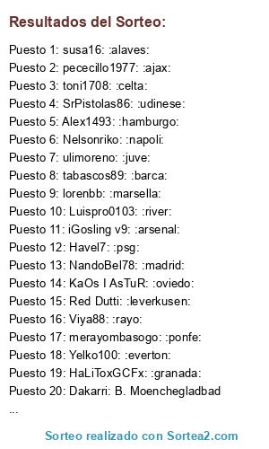 Lista de participantes: Adriantr127: :atmadrid:, adrylito: :malaga:, alead71: :tottenham:, alemalaga94: :bayern:, Alex1493: :hamburgo:, alexfcbarcelona: :dortmund:, AlexvsF1: :Norwich:, AndrewTorres: :sociedad:, Balles: :malmoe:, benniscuba: :roma:, buijin: :celtic:, CometHeaven79: :chelsea:, cudeiro: :bilbao:, Dakarri: B. Moenchegladbad, DaniBke: New York City, danygp89: :bour:, davidrikoone: :lisboa:, El8Pelocho: :lugo:, Ergion46: :monaco:, ferminnn: :nantes:, Goss83: :schalke:, haankko888: :galaxy:, HaLiToxGCFx: :granada:, Havel7: :psg:, iGosling v9: :arsenal:, Ivanxio: :sounders:, javitr: :city:, josegomisortega: :aston:, KaOs I AsTuR: :oviedo:, lorenbb: :marsella:, Luispro0103: :river:, merayombasogo: :ponfe:, misterserpico: :ham:, Mori1983: :fiore:, MrMohamRam: :liverpool:, n0jan: :cristal:, NandoBel78: :madrid:, Nelsonriko: :napoli:, pececillo1977: :ajax:, perikinho90: :cordoba:, pinolines: :sevilla:, Platero17: :oporto:, Red Dutti: :leverkusen:, Rokitys: :cska:, Saavexbox: :palmas:, Semmenup: :orlando:, sergiord14: Wolfsburgo:, sergiotabascos89: :united:, SpiffiestJose: :lyon:, SrPistolas86: :udinese:, StormFury: :elche:, susa16: :alaves:, tabascos89: :barca:, TATO XD: :depor:, TheForceMaker: :alcorcon:, toni1708: :celta:, trunks: :levante:, ulimoreno: :juve:, victub: :valencia:, Viya88: :rayo:, x chachiquesi x: :betis:, xSAMU: :benfica:, Yelko100: :everton:, zzzz jona zzzz: :boca:.