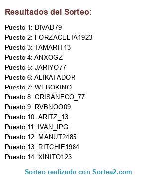 Lista de participantes: WEBOKINO, RVBNOO09, JARIYO77, ANXOGZ, TAMARIT13, FORZACELTA1923, RITCHIE1984, XINITO123, ALIKATADOR, IVAN_IPG, MANUT2485, ARITZ_13, DIVAD79, CRISANECO_77.