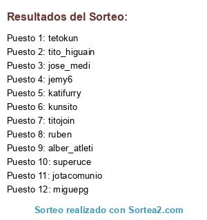 Lista de participantes: katifurry, jemy6, jotacomunio, superuce, miguepg, jose_medi, titojoin, kunsito, tito_higuain, alber_atleti, ruben, tetokun.