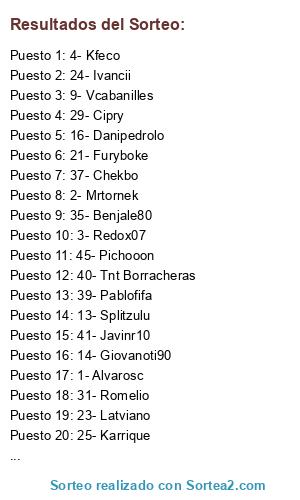 Lista de participantes: 1- Alvarosc, 2- Mrtornek, 3- Redox07, 4- Kfeco, 5- Borja ESP, 6- Mrtsgi, 7- Pierini23, 8- Chechuki, 9- Vcabanilles, 10- Jose Vicio, 11- Danibox7, 12- Sewillista, 13- Splitzulu, 14- Giovanoti90, 15- xMhr B1dalotx, 16- Danipedrolo, 17- Julibox, 18- Javiferrer, 19- Baldoraul, 20- Xabusa, 21- Furyboke, 22- Coronitass, 23- Latviano, 24- Ivancii, 25- Karrique, 26- Perizgz, 27- Aleivii, 28- Welli7, 29- Cipry, 30- Heavenlp, 31- Romelio, 32- Itachi 360, 33- Ruly Xhelazz, 34- Vintorlok, 35- Benjale80, 36- Fernandolh11, 37- Chekbo, 38- Evl Malaguista4, 39- Pablofifa, 40- Tnt Borracheras, 41- Javinr10, 42- Fransolo, 43- Manvicio, 44- Rubi146, 45- Pichooon, 46- Verdantplayer.