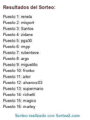Lista de participantes: rubenteve, richetti, Santos, supermario, miguelillo, misport, rmpp, zidane, marley, fronko, renela, alvarocc03, argo, pga30, magico, aitor.