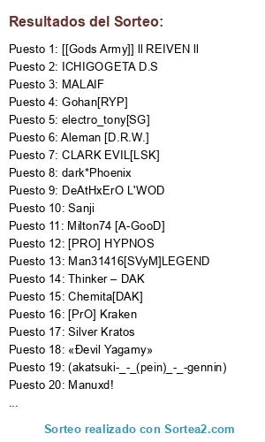 Lista de participantes: •.•.★ Amane Misa ★.•.• [Pнσєиιχ], S.S."†"A&D"†" Minos [2º Arkangel dimensional] //El Elegido... Messi//, Sanji, Calvoy, ۞Green Arrow ۞[SG][DIOS DEL INFRAMUNDO]™, Aster-Phoenix, Gohan[RYP], electro_tony[SG], Silver Kratos, CLARK EVIL[LSK], el monje malvado (este), [Pr0]VolKodLak, miguehead(disturbio08), Thor, BLADE(SOW), wShAka [LKS], Malicius Elberrrrrtt [Phoeniiixxxx], MALAIF, Aleman [D.R.W.], Man31416[SVyM]LEGEND, MauryHardy (JDS), Max2260 Cgm, [[Ģøđŝ Ąямγ]] Çŕĭslęŗ //§μη Ģǿđ//, KILLY, DeAtHxErO L'WOD, [[Ģøđŝ Ąямy]]۩†Maligno†۩, [PrO] Kraken, Sombrero de Paja, claus_9, dark*Phoenix, «Ðevil Yagamy», Thinker – DAK, Milton74 [A-GooD], [Pr0]Killer, ICHIGOGETA D.S, [PRO] HYPNOS, VoltioHakerS, ARJ, Dark-Slifer [SOD], -Pr0- John Smit, B*T*KRAkiles, Mike-DAK, keviin(RYP-OBELISK), L'Arc~en~Ciel, archer [phoenix], Nando15, Zato –DAK, RizThO18[C-gm], [[Gods Army]] ll REIVEN ll, [Z] Gσкυ [Z] [Ðιѕтυявισ08], Iori [Pнσєиιχ], (akatsuki-_-_(pein)_-_-gennin), Mexican stuped [Phoenix], [Tono (*Akat-Clan) Senju-Chunnin*)], Manuxd!, Chemita[DAK].