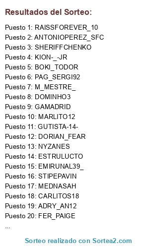 Lista de participantes: MALASOMBRA21, CAUBO12, GENOA_NPK02, HOOKIIIO, BRUNOCOUTO_6, DANIELITOPERU10, JU20NO, GOLIN82, GYRL_TFC, ADRY_AN12, GUTISTA-14-, ESTRULUCTO, ARMKINGARSHAK_2, PEP_TEAM1989, FER_PAIGE, DORIAN_FEAR, LABESTIANEGRA_10, CARLITOS18, RAISSFOREVER_10, SEM___1907, MUCAHIT21, KAMISAMA1095, RAF_934, LUCASSF_10, NYZANES, DURBE_, LOOKAGAJIĆ, ZEUSINJO, JHOEEL2_, KAMPFER555, DOMINHO3, UMBEE96_, STEJINN7, ORELD123, ANTONIOPEREZ_SFC, STIPEPAVIN, MARLITO12, CLAPPED_BY_MV, GAMADRID, SERGIABRAMO, DAVIDSNAKE89, JAVILOTA_14, KAISER-SH7 / THEKINGOFPES, PAG_SERGI92, KION-_-JR, LORISGAMBARE77O, DANII_SNIPER8, MEDNASAH, MISTYCBOX, ALONSOGRAYFOX, KULECROATIA, EKOH, SHARKGAR06, FER_DON3P, SHERIFFCHENKO, EMIRUNAL39_, CASES_89, CHECHE19, BOKI_TODOR, M_MESTRE_, ALEXALGUACIL_8, ADUMAT_6, DIFFSIDE_45, ARDA---GOLAAAZOOO.
