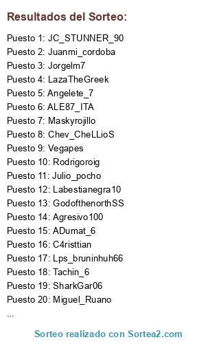 Lista de participantes: erkobra18, Abrahamm0726, Cheche19, Caubo12, Dominho3, ADumat_6, RoksaCZV22, Veldruuk, Juanmi_cordoba, W-jorcha-W, KaiSER-SH7, Marlito12, Labestianegra10, Piponayara, Enrimabe07, Mallorca_killer, Sem19071986, Cortex_xx, Pinchorevoleras, jordigonzalez, Kvothe_the_hero, SORAK_PRO, Chev_CheLLioS, Pipol-Imperador, F4r40n1988, AntGragera10, Young_pro97, Farbax, Adrianmaese, Imbaedo1, SharkGar06, Vegapes, Maskyrojillo, Julio_pocho, PEP_TEAM1989, Jorgelm7, Hectoryenzo, Agresivo100, Lps_bruninhuh66, C4risttian, JC_STUNNER_90, ALE87_ITA, YakiGames, Miguel_Ruano, Javitri, barboza12_, Sheriffchenko, Agustainer, Wantxope9, CinderellaMan_13, Buba_bsj, Mehman, Fer_Don3p, Rodrigoroig, Golin82, Amortee, LazaTheGreek, GodofthenorthSS, Tachin_6, Cases_89, Barlica_churros, B10_joker, Angelete_7, Ferran8r.