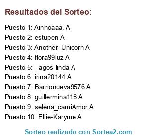 Lista de participantes: - agos-linda A, estupen A, irina20144 A, Another_Unicorn A, Ellie-Karyme A, flora99luz A, Barrionueva9576 A, Ainhoaaa. A, selena_camiAmor A, guillermina118 A.