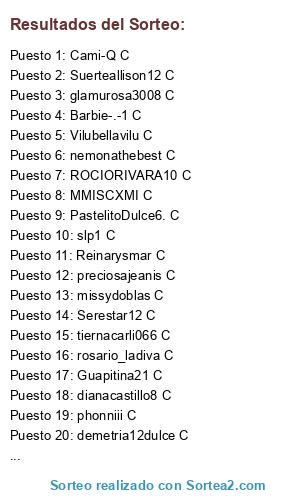 Lista de participantes: Suerteallison12 C, Vilubellavilu C, ROCIORIVARA10 C, glamurosa3008 C, rosario_ladiva C, Reinarysmar C, ANITALZON C, MMISCXMI C, slp1 C, Guapitina21 C, missydoblas C, yesica10000 C, demetria12dulce C, mily.78estrella C, HadaSophie123 C, Barbie-.-1 C, STEPHANYBC C, judit.2013 C, michelfiesta C, Serestar12 C, preciosajeanis C, dianacastillo8 C, PastelitoDulce6. C, tiernacarli066 C, Dary339 C, Cami-Q C, phonniii C, nemonathebest C.