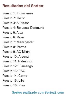 Lista de participantes: AC Milán, Ajax, Al Nassr, Arsenal, Borussia Dortmund, Celtic, Como, Flamengo, Fluminense, Lille, Manchester, Palestino, Parma, Pisa, PSG, River.