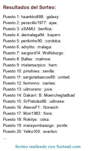 Lista de participantes: Adriantr127: :atmadrid:, adrylito: :malaga:, alead71: :tottenham:, alemalaga94: :bayern:, Alex1493: :hamburgo:, alexfcbarcelona: :dortmund:, AlexvsF1: :Norwich:, AndrewTorres: :sociedad:, Balles: :malmoe:, benniscuba: :roma:, buijin: :celtic:, CometHeaven79: :chelsea:, cudeiro: :bilbao:, Dakarri: B. Moenchegladbad, DaniBke: New York City, danygp89: :bour:, davidrikoone: :lisboa:, El8Pelocho: :lugo:, Ergion46: :monaco:, ferminnn: :nantes:, Goss83: :schalke:, haankko888: :galaxy:, HaLiToxGCFx: :granada:, Havel7: :psg:, iGosling v9: :arsenal:, Ivanxio: :sounders:, javitr: :city:, josegomisortega: :aston:, KaOs I AsTuR: :oviedo:, lorenbb: :marsella:, Luispro0103: :river:, merayombasogo: :ponfe:, misterserpico: :ham:, Mori1983: :fiore:, MrMohamRam: :liverpool:, n0jan: :cristal:, NandoBel78: :madrid:, Nelsonriko: :napoli:, pececillo1977: :ajax:, perikinho90: :cordoba:, pinolines: :sevilla:, Platero17: :oporto:, Red Dutti: :leverkusen:, Rokitys: :cska:, Saavexbox: :palmas:, Semmenup: :orlando:, sergiord14: Wolfsburgo:, sergiotabascos89: :united:, SpiffiestJose: :lyon:, SrPistolas86: :udinese:, StormFury: :elche:, susa16: :alaves:, tabascos89: :barca:, TATO XD: :depor:, TheForceMaker: :alcorcon:, toni1708: :celta:, trunks: :levante:, ulimoreno: :juve:, victub: :valencia:, Viya88: :rayo:, x chachiquesi x: :betis:, xSAMU: :benfica:, Yelko100: :everton:, zzzz jona zzzz: :boca:.