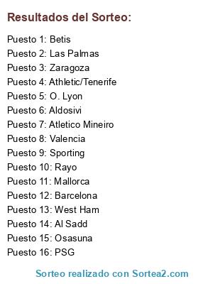 Lista de participantes: SC CORINTHIANS, GIRONA FC, REAL MADRID CF, REAL BETIS, KV MECHELEN o AS MONACO, GETAFE CF, C. ATLÉTICO MINEIRO, LIVERPOOL FC, CD MIRANDÉS, PARMA CALCIO 1913, REAL ZARAGOZA, OLYMPIQUE LYONNAIS, RC DEPORTIVO, RCD MALLORCA, C. ATLÉTICO DE MADRID, CAGLIARI CALCIO.