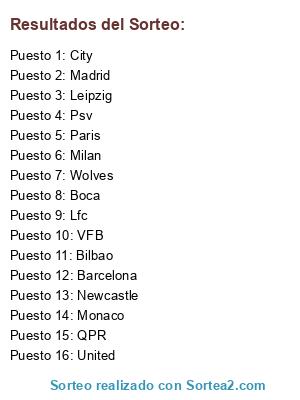 Lista de participantes: Lfc, Newcastle, United, Madrid, Paris, Bilbao, QPR, Psv, Leipzig, VFB, Monaco, City, Boca, Wolves, Milan, Barcelona.