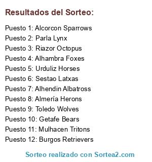 Lista de participantes: Riazor Octopus, Getafe Bears, Burgos Retrievers, Sestao Latxas, Urduliz Horses, Alcorcon Sparrows, Parla Lynx, Alhendin Albatross, Toledo Wolves, Alhambra Foxes, Mulhacen Tritons, Almería Herons.
