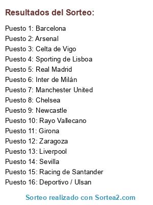 Lista de participantes: Hull, Sporting Lisboa, Dormund, Rayo Vallecano, Recreativo de Huelva, Murcia, Real Madrid, Barcelona, Manchester United, Sporting de Gijon, DC United, Atlético de Madrid, Juventus, Chelsea, Bayern Múnich, Milán.