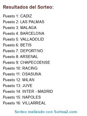 Lista de participantes: VILLARREAL, BARCELONA, LAS PALMAS, BETIS, DEPORTIVO, MILAN, CHAPECOENSE, INTER - MADRID, OSASUNA, MALAGA, VALLADOLID, ARSENAL, RACING, NAPOLES, CADIZ, JUVE.