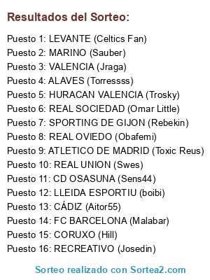 Lista de participantes: SPORTING DE GIJON (Rebekin), MARINO (Sauber), FC BARCELONA (Malabar), REAL SOCIEDAD (Omar Little), CORUXO (Hill), CD OSASUNA (Sens44), REAL OVIEDO (Obafemi), VALENCIA (Jraga), LLEIDA ESPORTIU (boibi), HURACAN VALENCIA (Trosky), ALAVES (Torressss), LEVANTE (Celtics Fan), REAL UNION (Swes), CÁDIZ (Aitor55), RECREATIVO (Josedin), ATLETICO DE MADRID (Toxic Reus).
